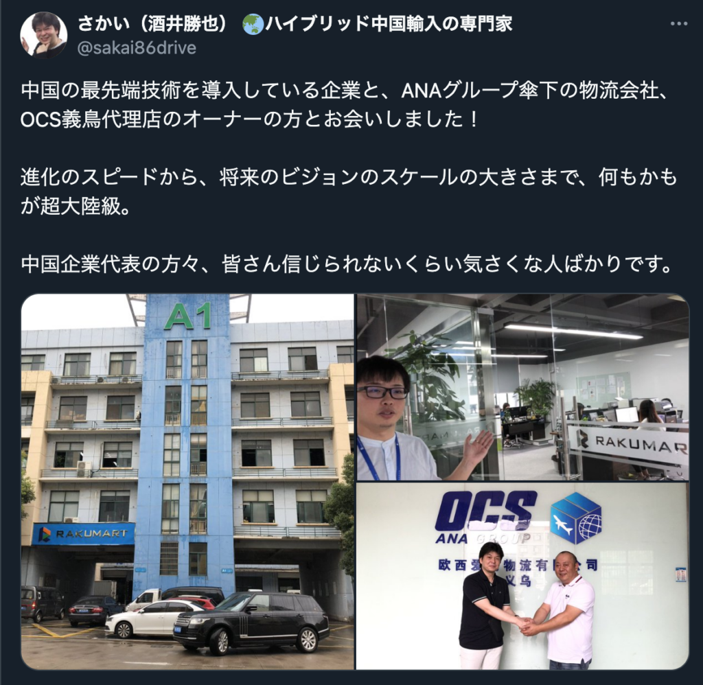 また、私は世界有数のIT企業である アリババに訪問するようになったり、 全日空(ANA)グループ傘下の物流会社、 OCS義鳥代理店のオーナーの方と お会いできるようになりました。